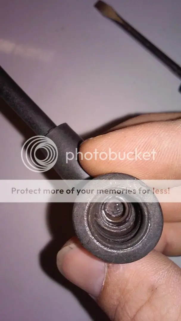 See the fuse-like thing between the spring and electrode? That's a ceramic 5k ohm resistor. A piece of metal the same size and shape should replace it just fine. In my case, it was a small bolt, cut down and filed appropriately. So I put it all back together and check resistance of the whole wire and get about 0.02 ohms. (The meter reads about that when you short the leads together anyway) So awesome! A free upgrade!!