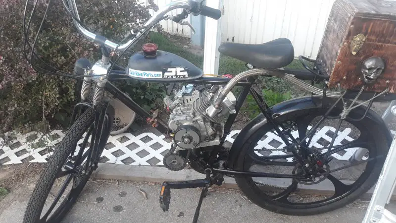 My hybrid makes 5 + hp with a reed modified, third transfer port and window piston China girl (and a lot of other mods) to make it go plus the ehub equal a 40 mph cruiser, without high rpms. It really needed decent braking and that's still a work in progress. I'm running 38 tooth and 2.2" Maxxi Holyrollers at 65 lb. pressure.