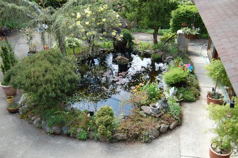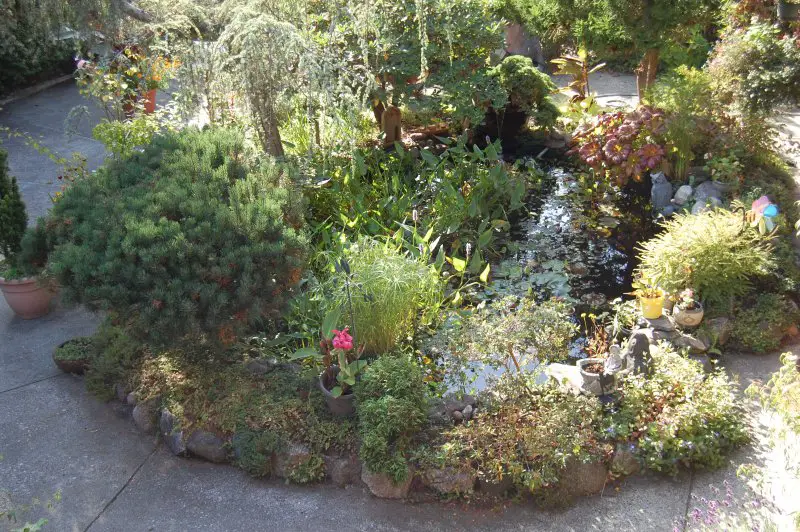 Found some photos of the back yard and the gold fish pond in the front courtyard both spring and late summer. We get a lot of lily pad flowers. The plant with the red leaves is a banana palm. Our big palm tree died from old age a couple of years ago.