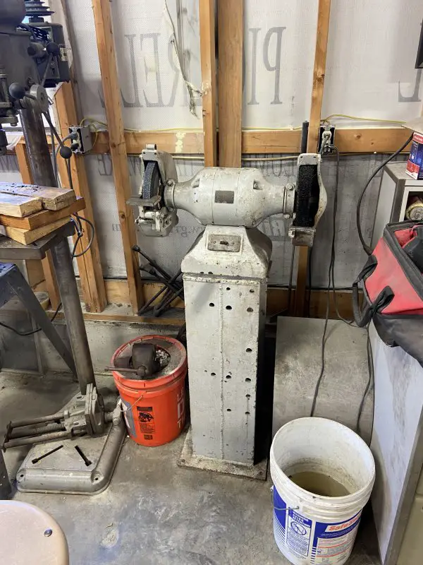 My 20ton hydraulic press w/small arbor press on the side. Cutting/brazing torch, and 1st drill press. Two more drum mounted vices