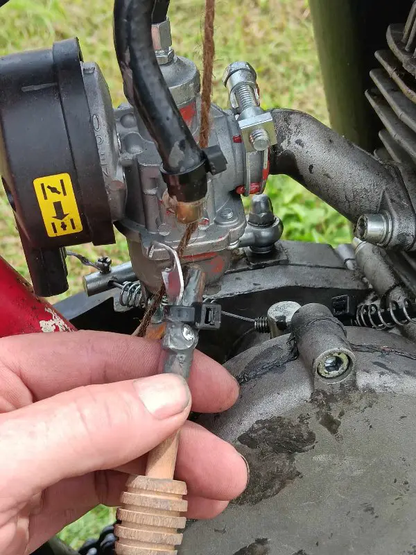 Lever arm extension added to make easy choke adjustment while riding road, but leverage was no friend to longevity of choke arm, since construction is flimsy: held together using rivet and cheap, fragile, sheet metal.