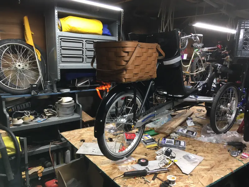 It was around this time that friends who live near our summer cabin on Eagles Nest Lake saw what we were up to with the electric trikes and did a search for used ones like ours. I told them I’d do the electric conversion on theirs for free if they wanted with them paying for kit, batteries and such. Lois found hers at a bike shop in Duluth and Jim located one on Craigs List in Minneapolis. (And I ordered kits and found batteries on line.) With winter coming on it was a good time to offer less than the asking price on both tadpoles. They offered $800.00 each and now had their own Rovers. And now I had four Rovers to convert. Winter in my part of the world lasts a long time with first snow in October and ice out on the lakes by May which makes for a shortish riding season, but longish building time. Having something to work on during what Fasteddie calls “the long cold dark” helps it pass by more quickly, particularly during this seemingly endless pandemic. With a fire in the wood stove, a cup of coffee and a project to tinker with I’m a happy boy. And thinking ahead to summer on the new bike trail through the forest gave me a smile, knowing that the four of us would have a chance to be kids again. They, too, had given up bicycle riding as age caught up with them. And it makes me feel good that I have an opportunity to help make their lives a little better in health and in fun. Indeed, life is good.