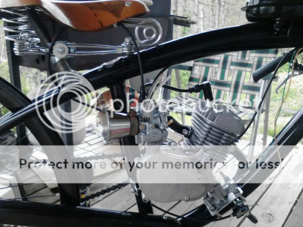 Future mods will include a proper expansion chamber, homemade CDI, high compression head, Whizzer 1 gallon tank (or something else that looks better than that stamped crap tank). I want to thank all of you guys. My countless hours reading these threads has got me to this point.