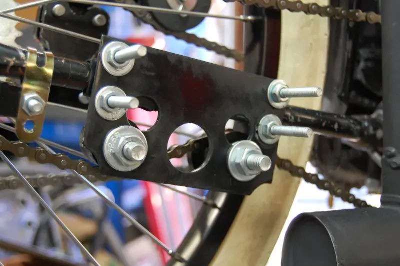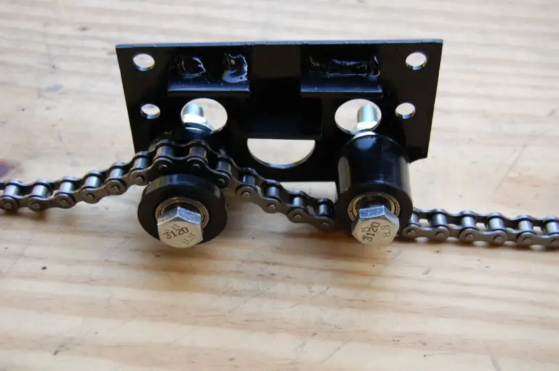 Small U bolts will hold the idler to the chain stay. If one link was removed the chain was too tight so I used two idler pulleys to take up the slack. That way slack is available to adjust the back wheel.