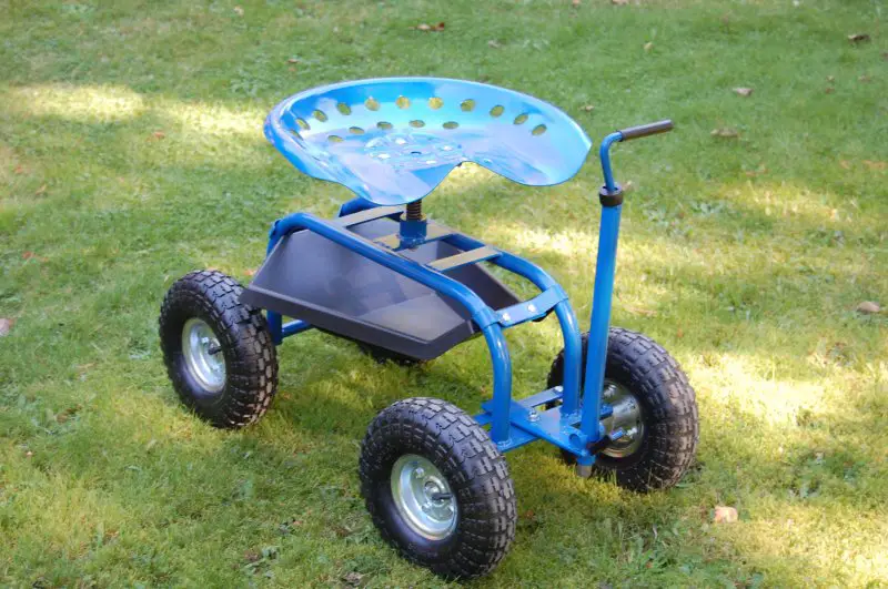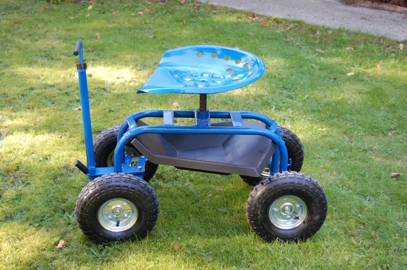 Because standing for very long is hard for me to do I use an old office chair to wheel myself back and forth in the garage as I work. My nephew and his wife bought me a rolling garden seat for my birthday to use since it sits up higher and has large wheels that roll easier. Really comfortable as well.