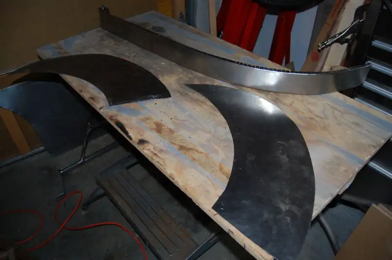 The sides are simply cut out of a sheet of body metal. The top is a strip of body metal that I bent the sides on. To do this without a sheet metal brake I measured a 1/4" in on each side then clamped two angle iron bed rails in the vise. Slid the metal in and put the scribe mark even with the top edge of the angle iron.