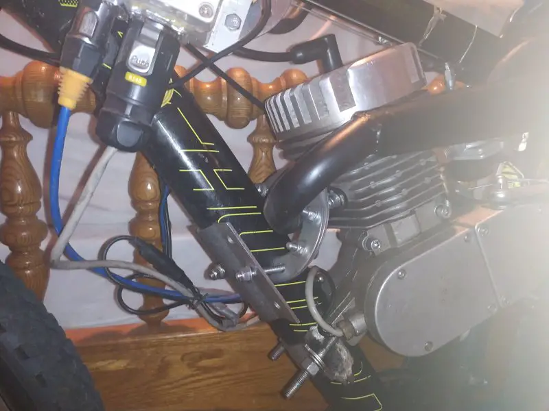 The clutch lever in my kit was trash from the first. I never could make it work worth a darn, so I replaced it with a brake lever I had laying about. Here is the trick. I cut a piece of old inner tube to lock the handle up so I could roll the bike in and out. I leave it on the grip so I can use it to hold the clutch in if I need to adjust the bike.