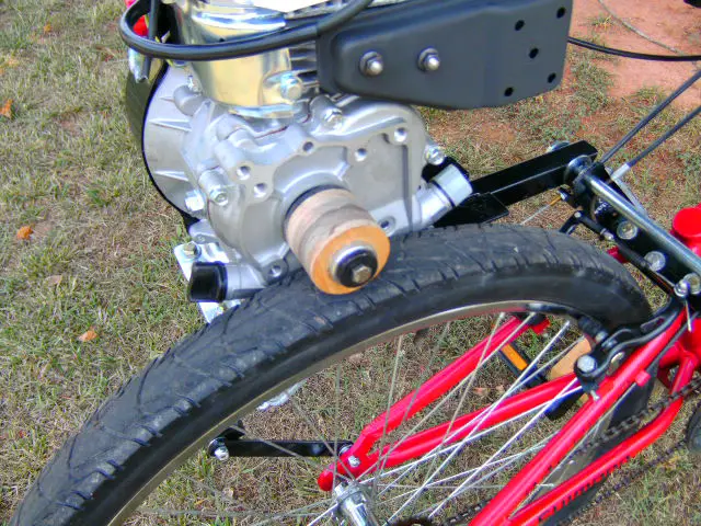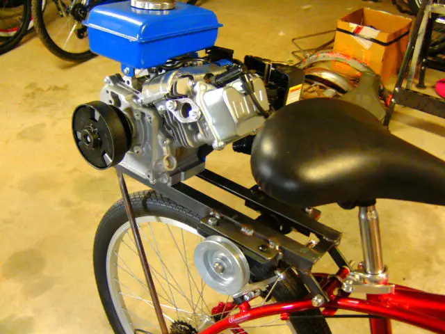The plan is a scissor lift mount with a little HF engine centered over the rear wheel. I like the simplicity of CB's off-set FD scissor lift and I really like his centered version with the centrifugal clutch and jackshafted FD roller. My reason for combining ideas is that I feel the need to be able to shut off the engine while pedaling or coasting and be able to bump start it when approaching a hill. This combo should provide that.