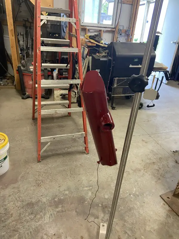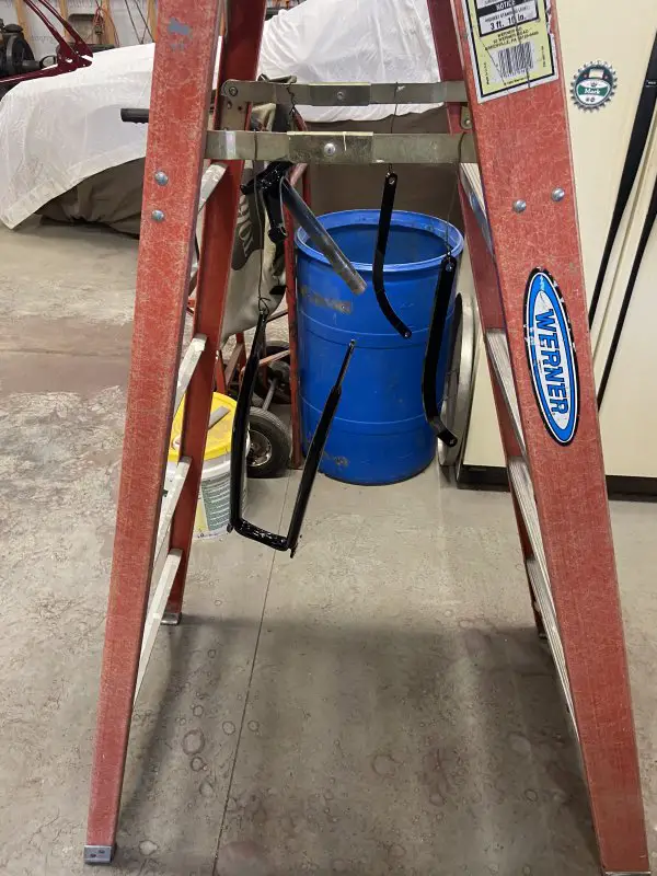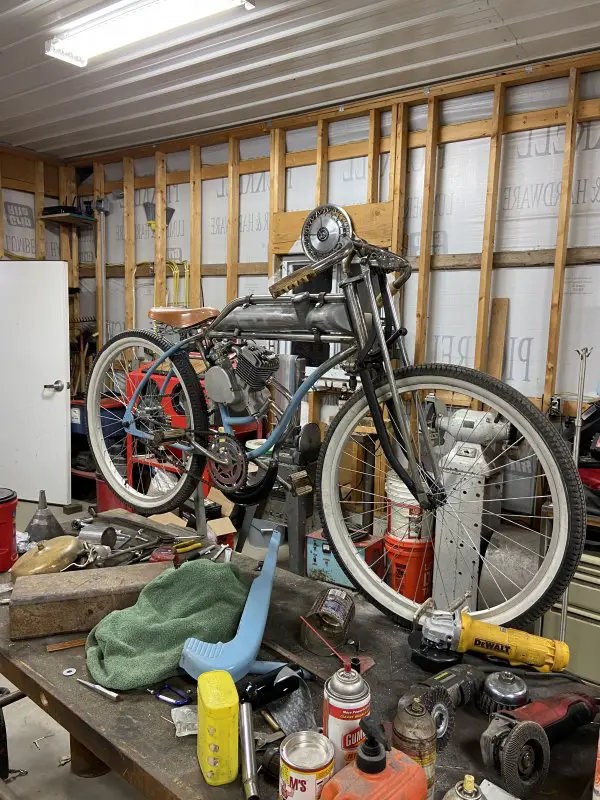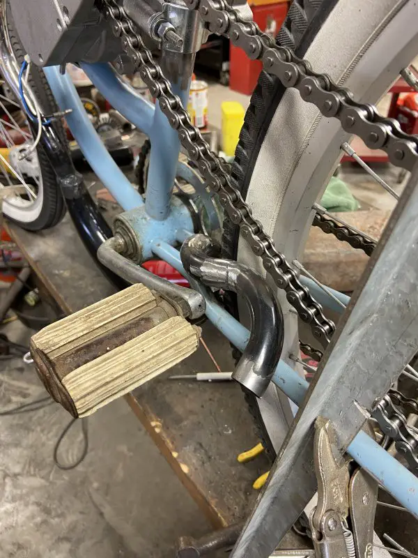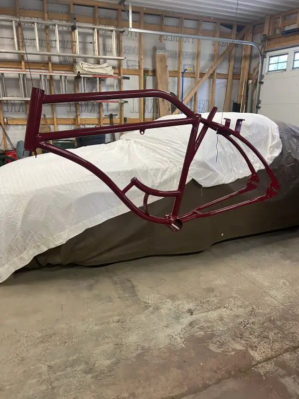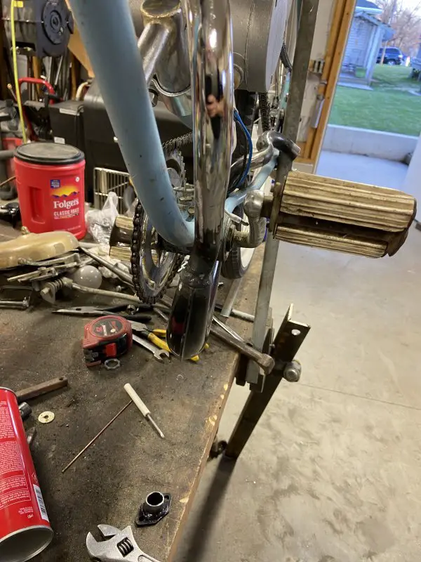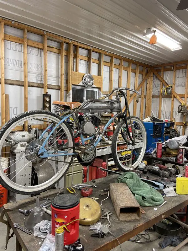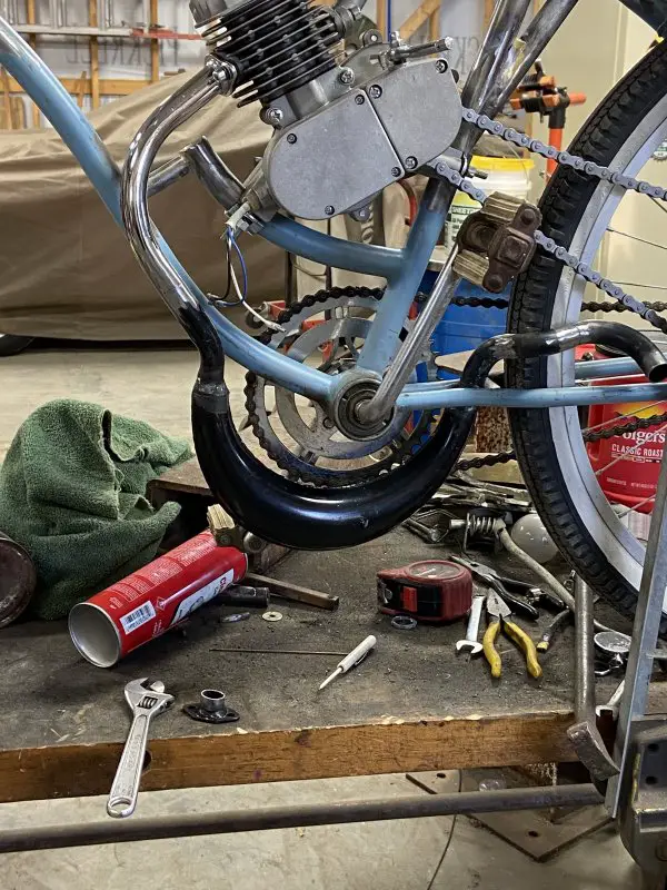 It’s been a busy, productive afternoon in my shop. I got my custom exhaust system all pieced together and welded.I wanted to use the banana expansion chamber, but I wanted it slung low under the frame/engine. I brought the exit up between the rear frame rails. I kind of like the look, kind of gives it the illusion of a drop loop frame .