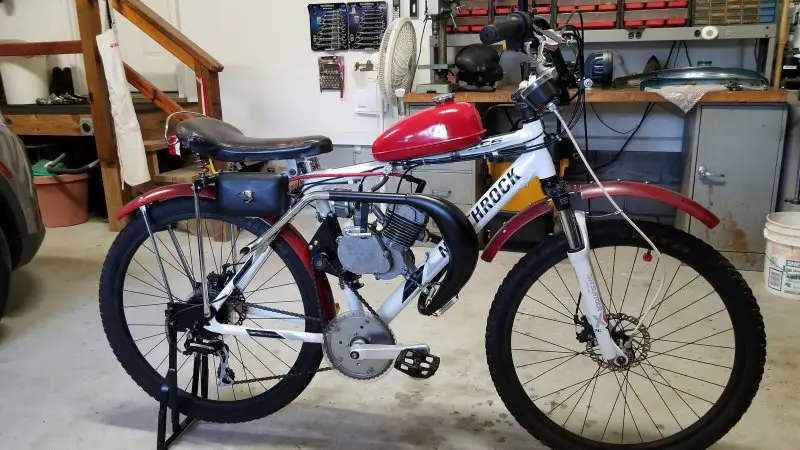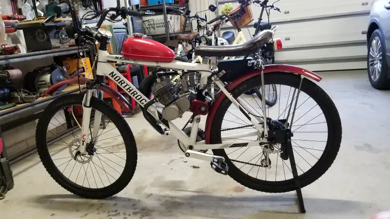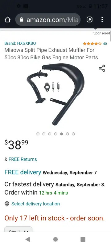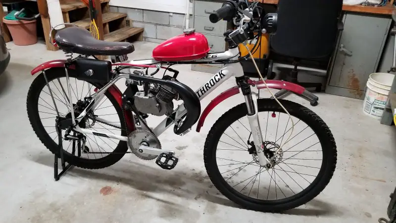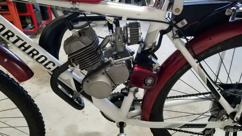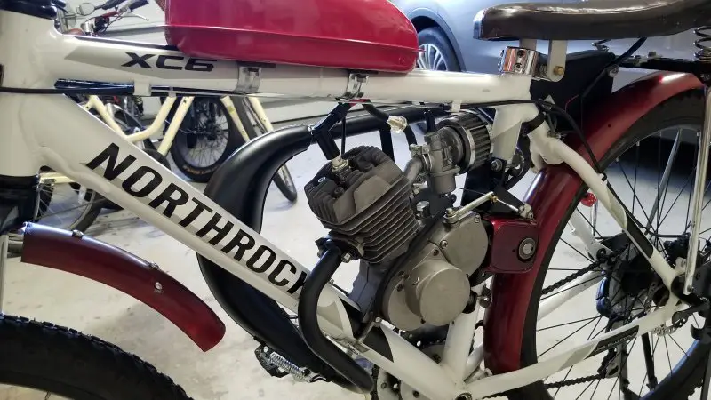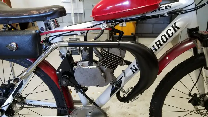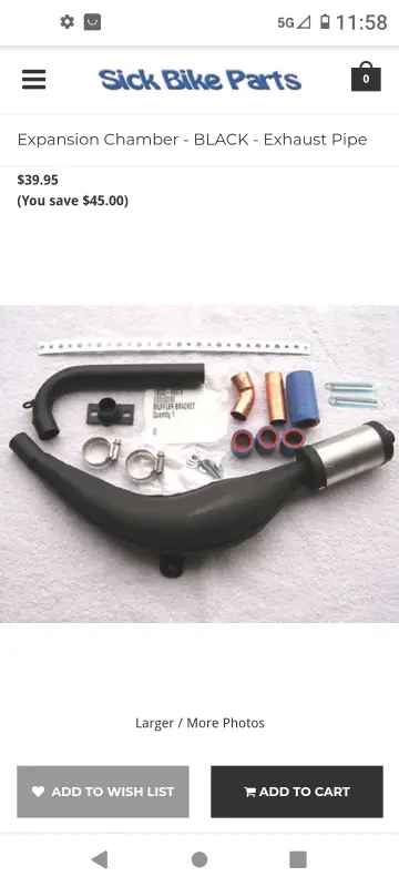 I can't seem to leave well enough alone! Wasn't really satisfied with my Chinagal's performance, so I swapped out my enduro-style expansion chamber for a dirt-bike style wrap-around. First I tried an expensive KZ65 replica that was big, expensive, and extremely well made. Unfortunately, the angles did not work on my configuration and the mounting flange didn't line up. To say I was disappointed would be an understatement, but I sucked it up and ordered a cheaper pipe from China, and I could not be happier with it. The installation was easy and even though the belly is smaller, it noticeably increased my output. I like the way the pipe is designed in two pieces for ease of installation and ease of adjustment. I had to raise the support slot slightly where it bolts to the clutch cover, but that was simple compared to most exhaust modifications I've done in the past. I added an extension to the outlet pipe to keep it from blowing oil up my bloomers! Removing the left side pipe cleared the way for a recoil starter. Kick starting works well, but it puts a pretty good strain on the clutch and the rest of the drive train like the SBP freewheel and chains. Any suggestions on the best recoil? I tried one several years ago and it lasted about a month. Hopefully, they are better now.