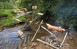 Again though, for power generation I'd not shrug off the more traditional water wheel, or paddle wheel (to help differentiate) & in fact some years ago I threw together a DIY cob-job paddle wheel that sufficed to power my 19' camper for almost a year out of little more then some chopped wood pallets, a bicycle wheel & the alternator filched out of my truck (& the two deep cycle camper batts) - though this was way up in northern Vermont on a steep hillside, so the creek had both volume and pressure to work with: https://www.google.com/maps/place/Belvidere,+VT