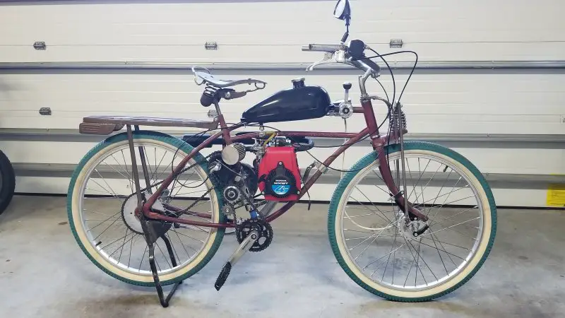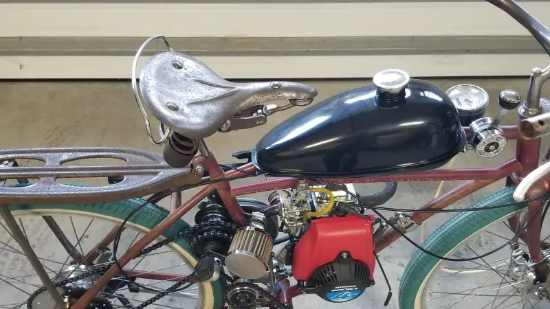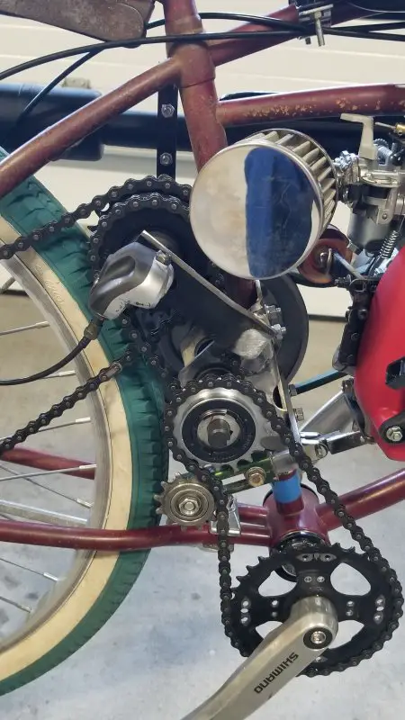 I steel-wooled all of the rust before swapping out the rusted steel wheels for fine Arayas laced to drum brakes with 11 gauge spokes front and aft. A Sturmey Archer X-FD (90mm) front drum drives the speedometer gear. The gear cassette on the vintage Schwinn rear hub was replaced with an adapter that accommodates a 44-tooth sprocket. The SBP jackshaft was modified to house a Shimano silent clutch 3-speed hub to serve as a tranny using a belt primary drive. A Shimano single speed freewheel allows the jackshaft to turn without driving the pedals. A 3-speed suicide shifter is attached to the crossbar in front of the extended fuel tank.