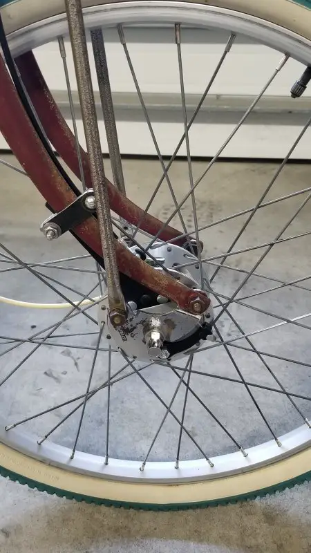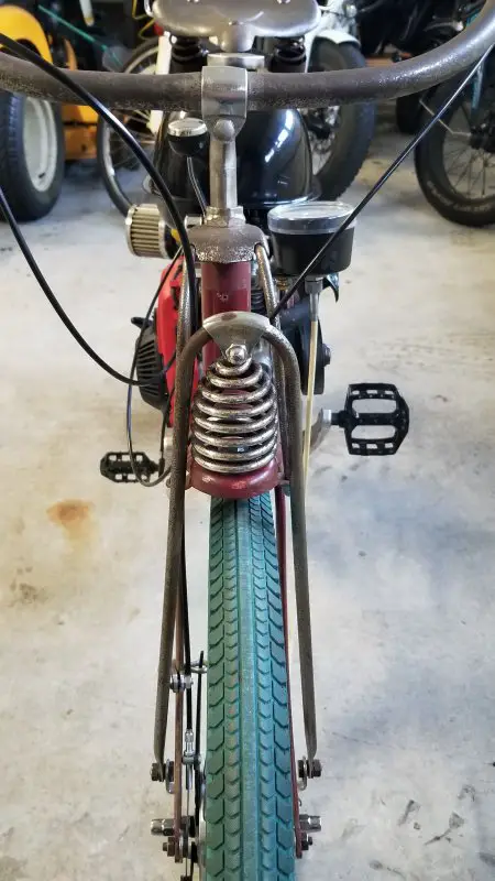 What was so disaster about your tandem build because I just did one here recently I didn't have any problems other than cut a little here weld a little there you know but what was the problem? Maybe I can shine a little light on your situation. Sweet bike by the way.Was tempted to hang it up after my disastrous tandem build. Then a 1950 JC Higgins Beehive Springer caught my eye and the ole flame was rekindled. Was instantly bit by the nostalgia bug and swept back to my first Whizzer which had a springer front end and drum brakes. I loved how fluid the bike behaved on the bumpiest roads. This bike spent most of its life sitting under a tree enduring the elements. There was plenty of rust to be removed, but from the condition of the components suggest she wasn't ridden much. The pivots for the springer front end were still tight and all of the bearings were good, Most important, the bike was complete and unmolested.