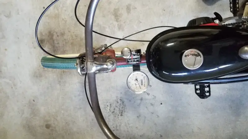 The deteriorated padding was removed from the springer seat leaving a bare pan which looks vintage and works perfectly. Vintage brake levers preserve the vintage look of the original swept back handlebars. A throttle control from an ATV is currently in place, but might be replaced with a vintage moped twist throttle. The vintage speedometer is a good complement to the suicide shifter.