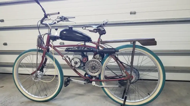 Man that was 68 years ago, LOL. But just like yesterday, I was 16 with paperroute. I was just like a Wizzer, had the same rear pulley, and about the same ratio. The really thing was the clutch, it was kind of like the china engines, but instead of pads it had 5 or 6 disks. I road the thing day and night for a couple years, untill a rod bolt come lose and twisted the rod off. I located a dealer, even sent the good piston it to match, all I got back was a different piston and not the oridgnal. I ended up selling what was left and built another a lot like yours, 1 1/2 hp Briggs with a V plex clutch., then trades, it plus $75 for a mode A, good old days.............Curt, Like your pipe setup.How did that Monark run, Curt? Was it belt driven like Whizzers? I recall that either Monarks or the Marmans had problems with soft crankshafts. Both were cool looking bikes for sure.