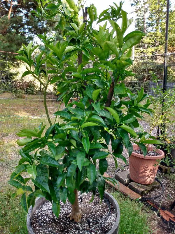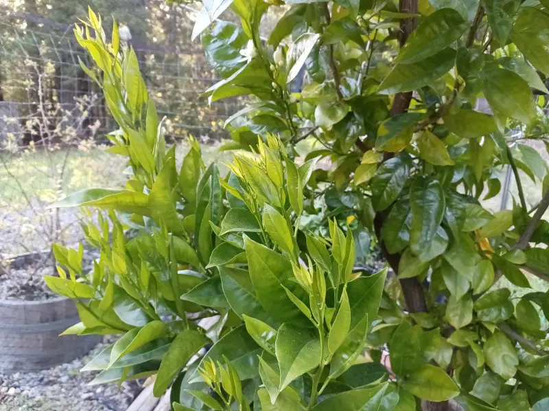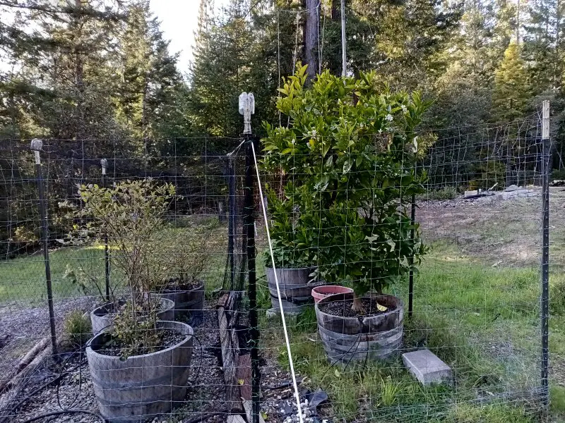You can probably tell which picture is of the orange tree 9 months after taking it to a more temperate climate. It is now about 1 an 1/2 years from the place where in winter I took it inside, but still that was not doing it well. Now it is on a path with lots of feeding and care that it has probably over 100 blooms an the leaves are being replaced and branches filling out to tube shape I am aiming for when pruning. The deer may try to get at leaves near the fence so maybe I'll be adding a section of smaller wire grid fence to areas to prevent the deer jaw to fit through an grab at the tree. Hops are starting again as well as blueberries. I have used granular fertilizer as well as the water soluble with sprayer.