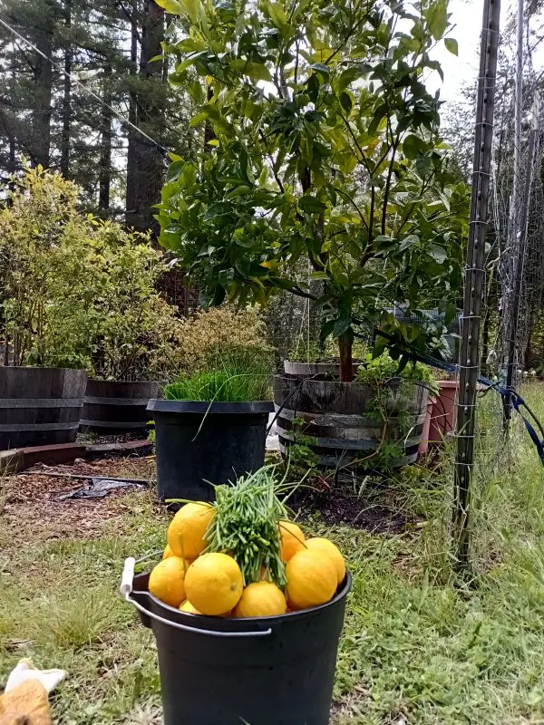 Okra of mine never panned out well. I did get more than 1/2 gallon blueberries and 20lbs of oranges from half wine barrel planters so far. Battery powered digital water timer does most of the work. Fertilize plants a couple times a year and try not to need to weed the garden.
