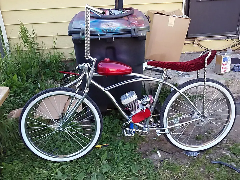 i know what you mean about our roads here LOL the state flower is out in force damn orange and white flowers LOL that frame and parts for just the bike cost me damn near 700.00 puncture resistant tubes the retro white wall tires that fork isn't cheap either but hey I wanted a sound bike that will do what I want it to so so I worked the cylinder the piston added that reed valve went with the jake head and the lightning bolt ignition for good measure now im waiting on my chrome throttle and hand grip so I can open the throat of that runtong carb any idea on the jet ill need here in Michigan????