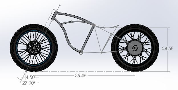 The bike is currently running a 19” rim or about 25” OD, setup for an estimated ....mph. (in race mode). This is about ...mph faster than I really want to go. Since both wheels are going to change with the fork change, I feel it is a good time to go to 17” rims with some smaller tires. Hoping to reduce rim and tire weight by about 5lb each. Replacing the K10 fork with a relatively modern dual crown bicycle fork will help with another 10lb easily. Current weight is around 165 and trying to get it down under 145lb. A smaller 22.5”od tire will reduce gear ratio by about 10%, hopefully reducing top speed to around ...mph.