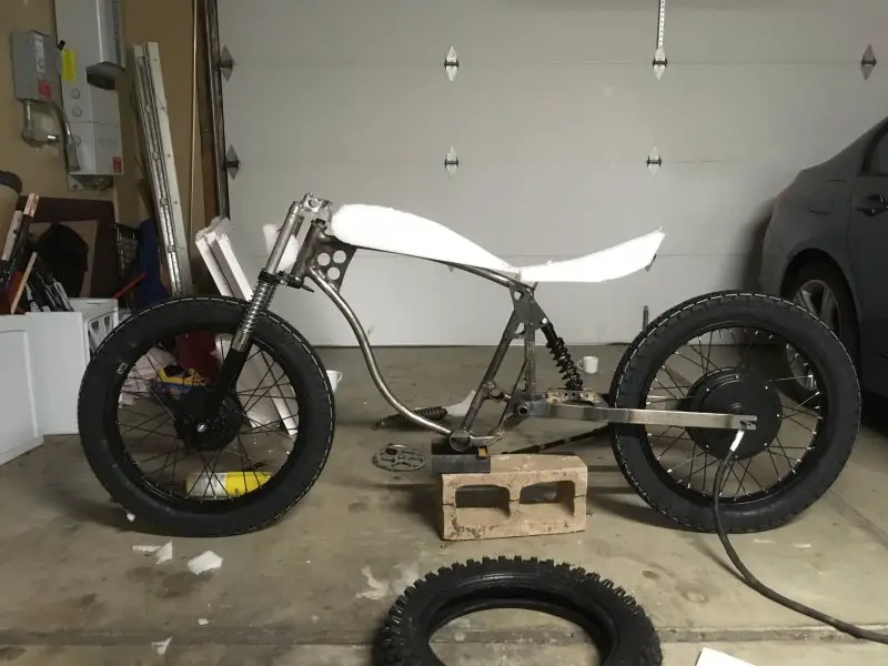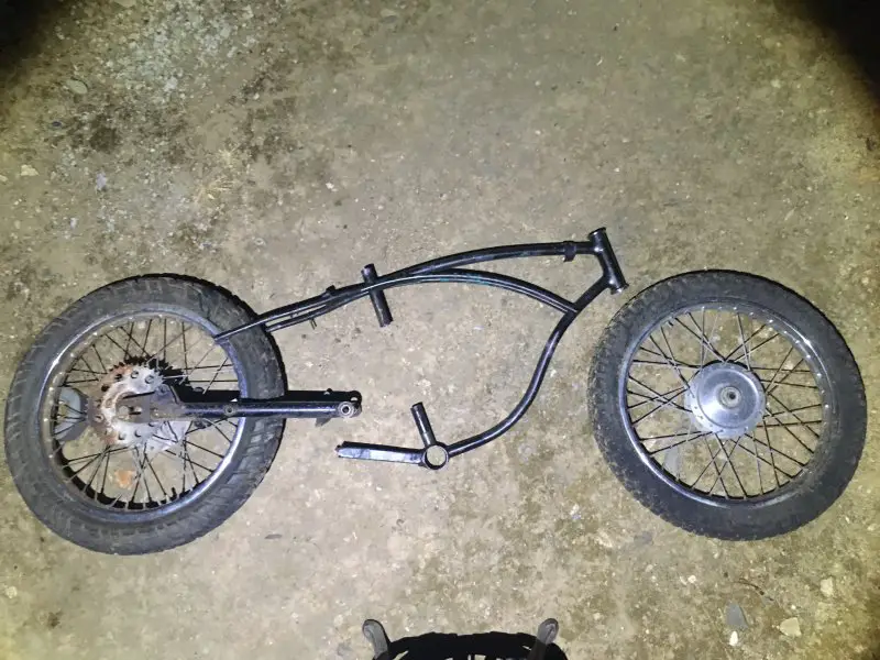 Here’s the current state of the bike. Not much left of the cruiser frame. This is actually the same frame that I used in my 212er before it got a catastrophic frame crack after thousands of miles which led to me building the 212 Yamaha bike. Needing a rough frame to cut up I did not hesitate to modify the crap out of it.