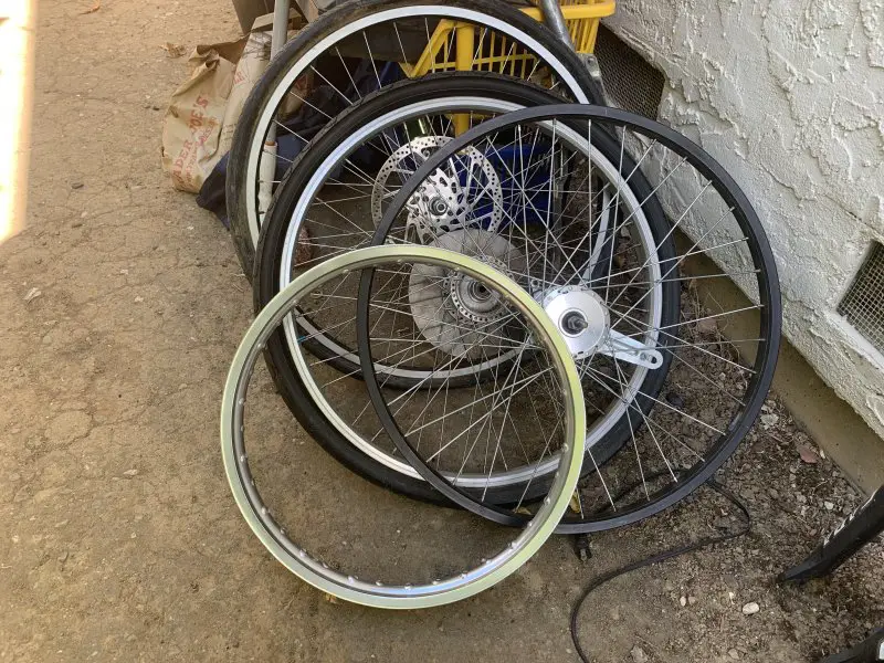 Well, took out the cup/cone bearings from the disc hub'd wheel, the one in the pile pictured above. Sadly the bores measure about 15 thousandths smaller than 30mm. Too bad, have a sealed bearing axle with two bearings brand new 30mm OD just waitin'. Could take it to a shop... it wouldn't be cheap.. or just buy a hub... ugh, hate this part. Going on ebay, aliexpress, searching, see what's out there, blah blah blah.