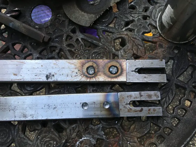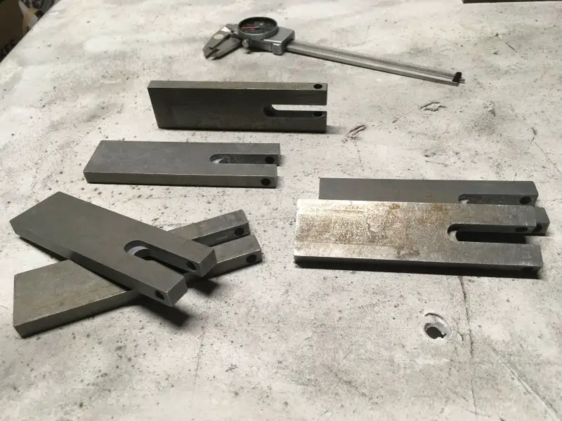 Drill jigs are welded up with material on the sides to align the bar in the jig, have the four holes, with the bar locating on a pin pressed in at the end of the jig with a sight hole to make sure the bar is seated up against the pin before drilling. The other side of the jig is used for scribing overall length line. No pic of the drill jigs, but here are some 1/4” thick bars full of burrs with a scrapped test length of material on the left.