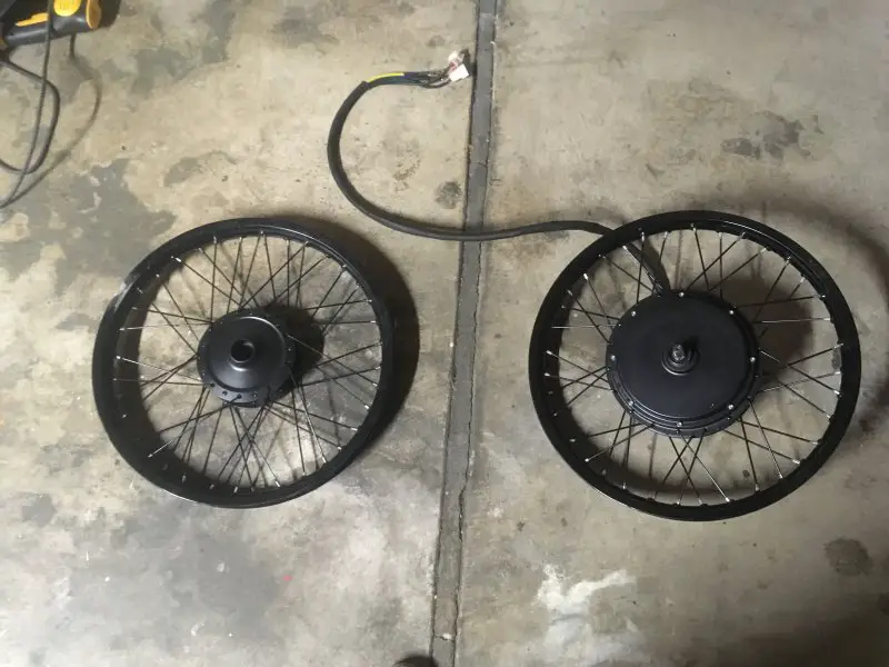 Built up some wheels. 19x1.6 with 8g spokes, a 5” drum in the front and an 8” core hub motor in the back. Rear wheel with tire weighs a whopping 43lbs!