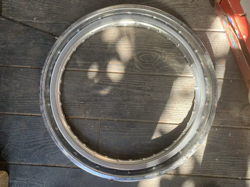 These rims are 1.4”w inside and about 1.9”w outside. I think the biggest tire I can fit is about an 80mm wide. Probably gonna go with 70fr 80rr. Pictured compared to 19x1.6 steel rim.