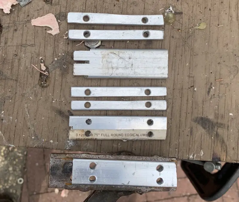 So the best deal I could find was around $45 for a few bars of 1x.25 and .75x.125 full round edge bar. From each battery bar length of material i would get two bars. I made an easy manual working process with drill jigs for each width of material. I would drill 4 holes and scribe a line for length, on both ends of the bar, then switch on a cheap craigslist table saw to make lengthwise and part off cuts to get 4 bars. On the 3/4 inch bar the round edge is only 1/16” radius but on the bigger bar it’s double and needs to get cut off as well. So the 3/4” bar took one cut about 3 inches long down the middle, and the 1” got left edge, right edge, and down the middle. I felt before buying the saw that it would do the job, and it did.